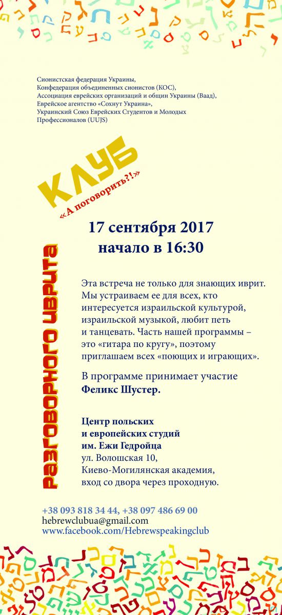 В воскресенье, 17 сентября, в 16:00 Клуб разговорного иврита приглашает всех на открытие нового сезона.