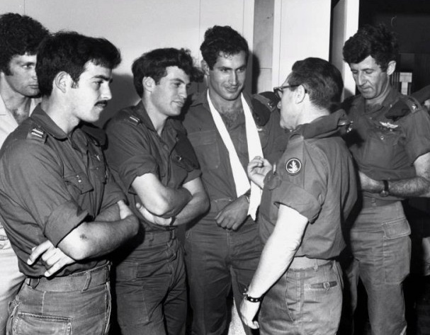 Бойцы спецназа. В центре — Биньямин Нетанияху ( с перевязанной рукой), слева от него — Узи Даян