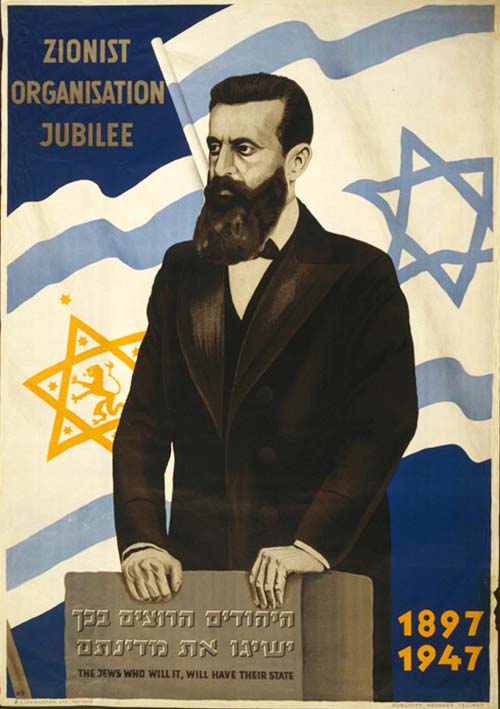 Один из духовных лидеров евреев Европы рав Шимшон Рафаэль Гирш Теодор Герцль на плакате к 50-летию Всемирной сионистской организации