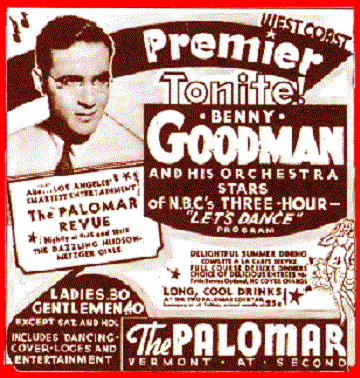 В 1935-м нужда заставила безработный оркестр отправиться на гастроли по США в надежде на заработок. По пути их следования через городки Среднего Запада выступления не пользовались особой популярностью, залы были почти пусты. Наконец, оркестр добрался до Лос-Анджелеса. Финансовая ситуация была критической. Публика воспринимала танцевальную музыку вяло. Тогда, видя все это, барабанщик воскликнул: «Ребята! Если это наш последний концерт, давайте сыграем его так, как бы нам не было стыдно себя проводить!» И они заиграли свинг в полную силу со всей мощью и необузданностью. Публика взвыла от восторга, ведь именно этого они ждали! Ради этого пришли!