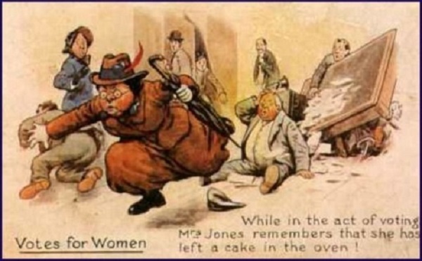 У первых политически активных женщин — суфражисток (англ. suffrage — избирательное право) — было много оппонентов. Но и дамы не давали себя в обиду и отнюдь не были обделены чувством юмора. Например, Элис Миллер объясняла, почему именно мужчины не должны голосовать:
