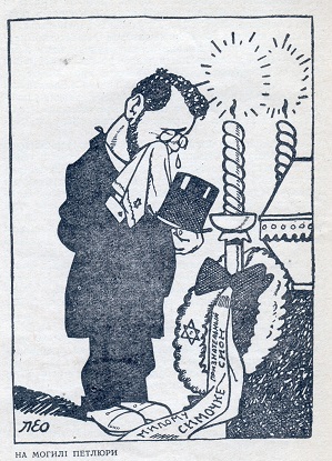 Обложка книги Кичко и карикатура из скандального «труда».  Подпись: Жаботинский (слезно) на могиле Петлюры: «Пусть земля тебе будет пухом… из еврейских перин»