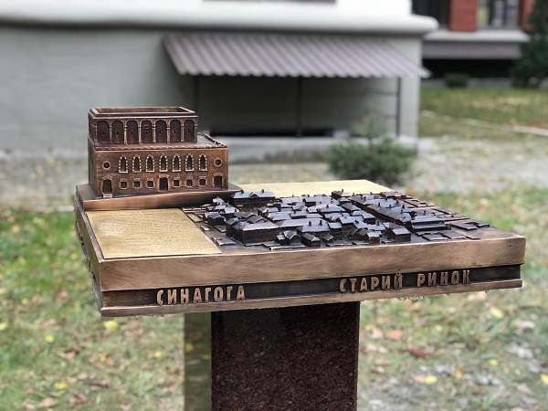 Так и осталась бы синагога лишь на старых открытках, если бы не проект «Бронзовый Тернополь», в рамках которого на улицах появляются макеты-скульптуры утраченных городом зданий. Историки работают с архивными материалами, чтобы скульпторы и художники могли воспроизвести знаковые для Тернополя объекты. Так, ранее были установлены макеты костела и первой гимназии. Масштаб бронзового макета синагоги 1:100, и он дополнен макетом не существующей ныне рыночной площади в масштабе 1:600, которая играет роль своеобразной карты-схемы. Здесь воспроизведена застройка центра города, аптека Фройденталь (единственный уцелевший после войны дом на площади), дом мясников, бывший костел, колодец и т.д.